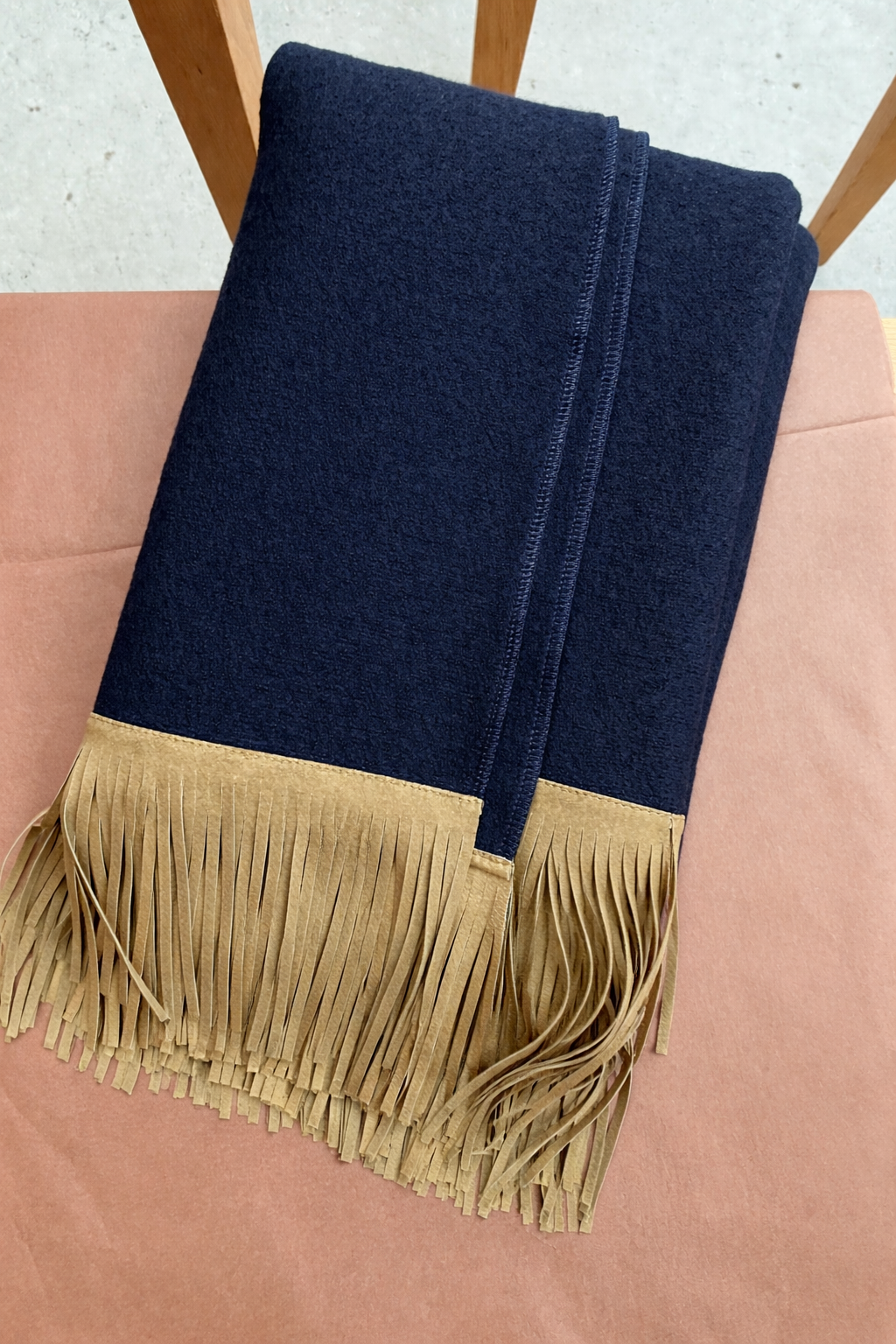 Marineblau mit lodenbraunen Fransen